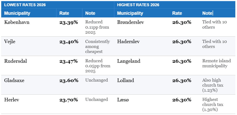 Rates range from 23.39% (Copenhagen) to 26.30% across 11 municipalities. On a salary of DKK 600,000, that spread is worth roughly DKK 17,000 a year.